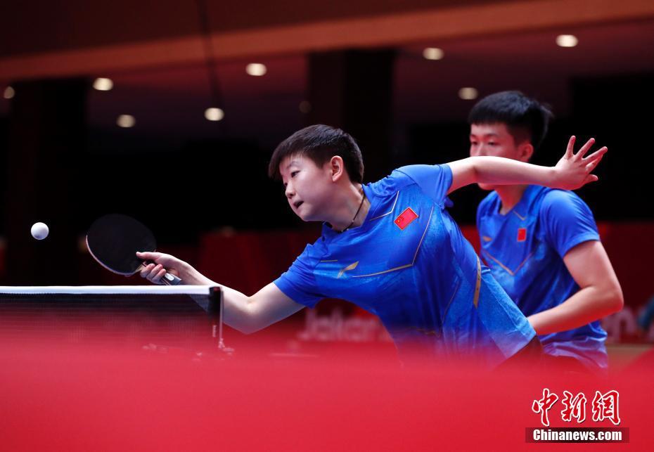 中国组合王楚钦/孙颖莎4比2击败队友林高远/王曼昱获得冠军。图为王楚钦/孙颖莎在比赛中。 中新社记者 刘关关 摄