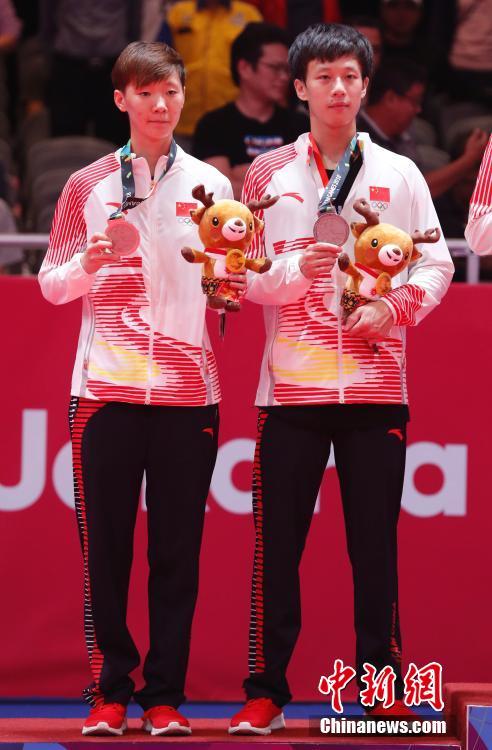 林高远/王曼昱展示银牌。 中新社记者 刘关关 摄