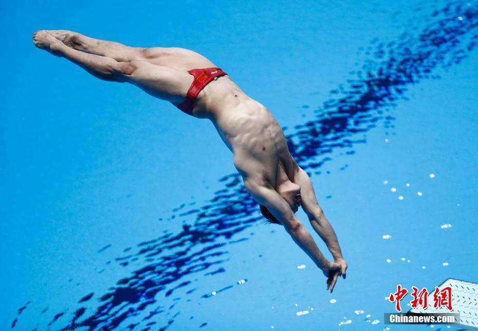 8月30日,雅加达亚运会跳水男子1米板决赛,中国选手彭健烽以462.15分夺得冠军,刘成铭获得银牌。图为彭健烽在比赛中。 中新社记者 杜洋 摄