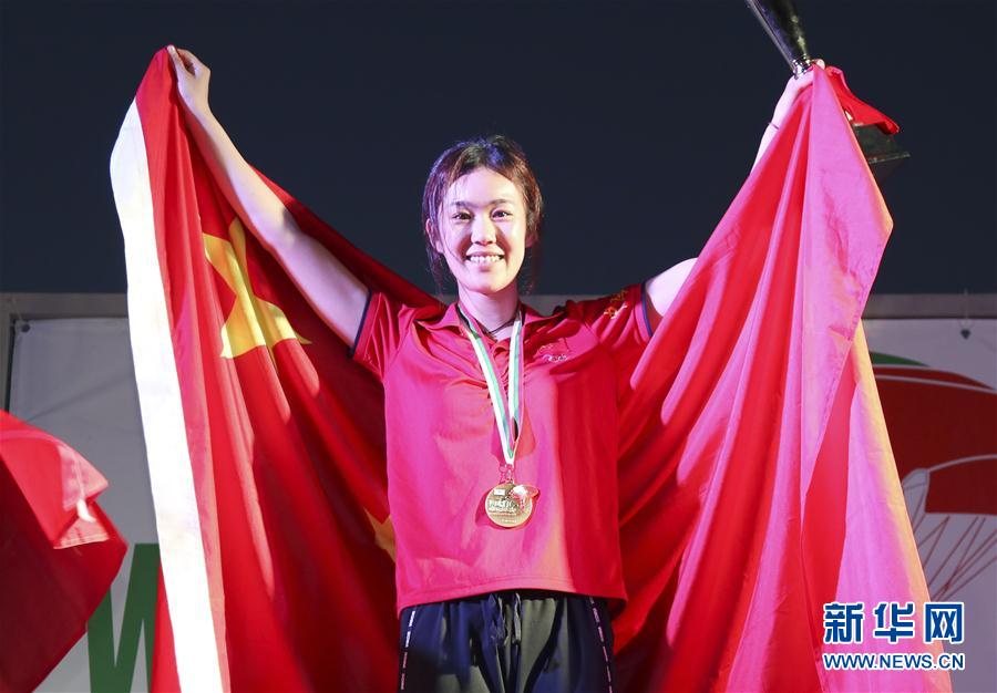 8月30日,中国跳伞运动员邢亚萍在女子全能颁奖仪式上庆祝。在当日举行的女子全能跳伞比赛中,20岁的中国跳伞运动员邢亚萍勇夺个人全能金牌,她还获得世界青年(24岁以下)个人全能、定点和特技三个项目的金牌。 当日,第35届世界跳伞锦标赛和第九届世界青年跳伞锦标赛在保加利亚蒙塔纳落幕。中国国家跳伞队勇夺六金。 新华社记者战小漪摄