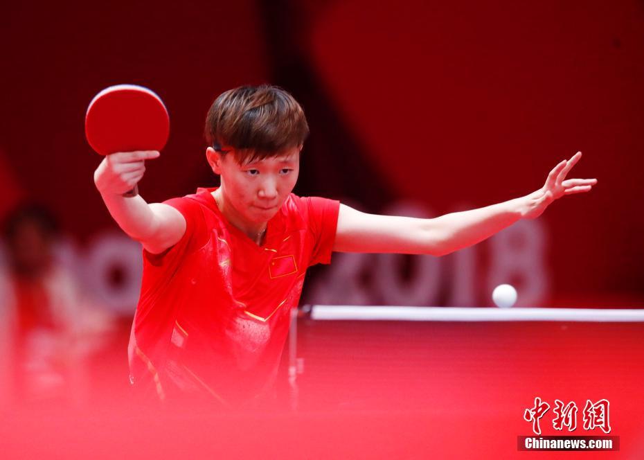 当地时间8月31日,在第18届亚运会乒乓球女单比赛中,中国选手王曼昱战胜对手,晋级四强。图为王曼昱在比赛中。中新社记者 刘关关 摄
