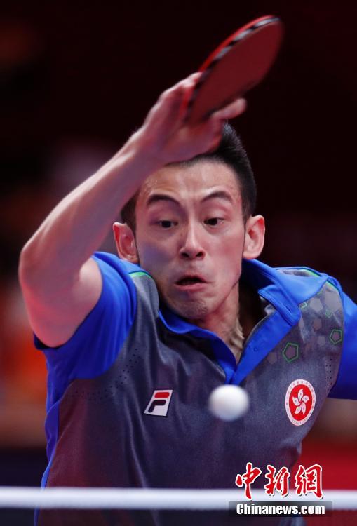 当地时间8月31日,在第18届亚运会乒乓球男单比赛中,中国香港选手黄镇廷爆冷负于伊朗选手NOSHAD ALAMIYAN DARONKOLAEI,无缘四强。图为黄镇廷在比赛中。中新社记者 刘关关 摄