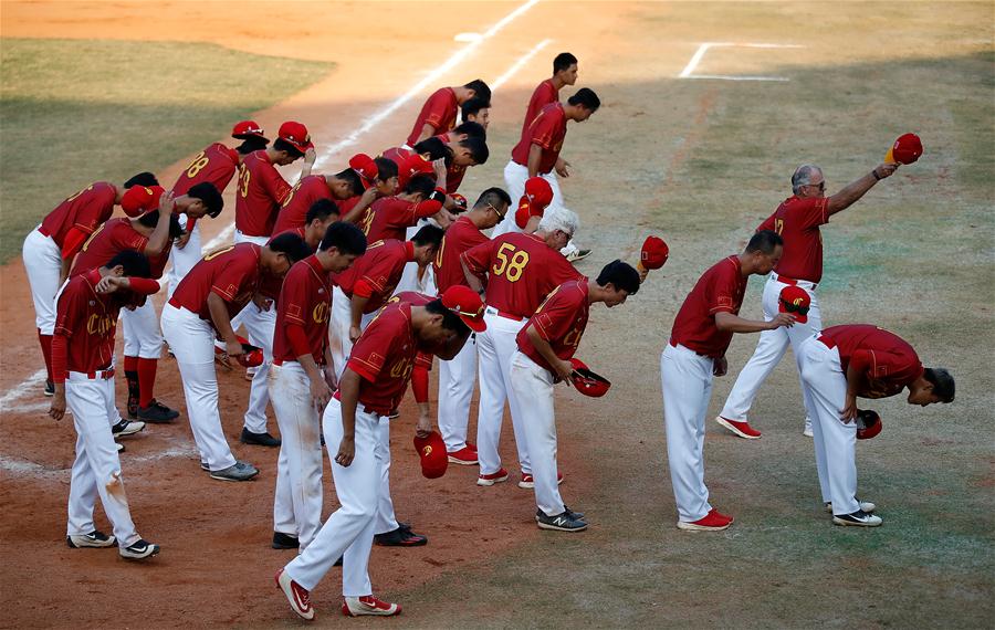 8月31日,中国队球员在赛后向观众致意。 当日,在第18届亚运会棒球男子四强超级循环赛中,中国队以1比10不敌韩国队。 新华社记者王丽莉摄