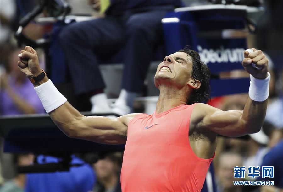 8月31日,纳达尔在比赛后庆祝。 当日,在2018美国网球公开赛男单第三轮比赛中,西班牙选手纳达尔以3比1战胜俄罗斯选手卡查诺夫,晋级十六强。 新华社记者王迎摄
