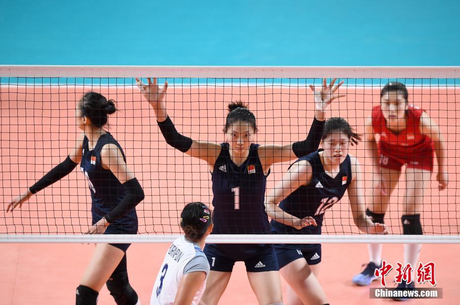 9月1日,2018年雅加达亚运会女排决赛,中国女排迎战首次闯入亚运会决赛的泰国女排。中国女排以3-0横扫泰国女排夺冠,三局比分为25-19、25-17和25-13,这是中国女排亚运会第8个冠军。图为中国队袁心玥(1号)等人组织防守。中新社记者 侯宇 摄