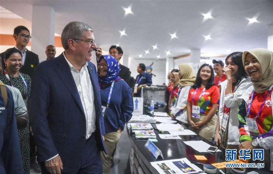 9月2日,国际奥委会主席巴赫(左)到访亚运会主新闻中心。 新华社记者李响摄