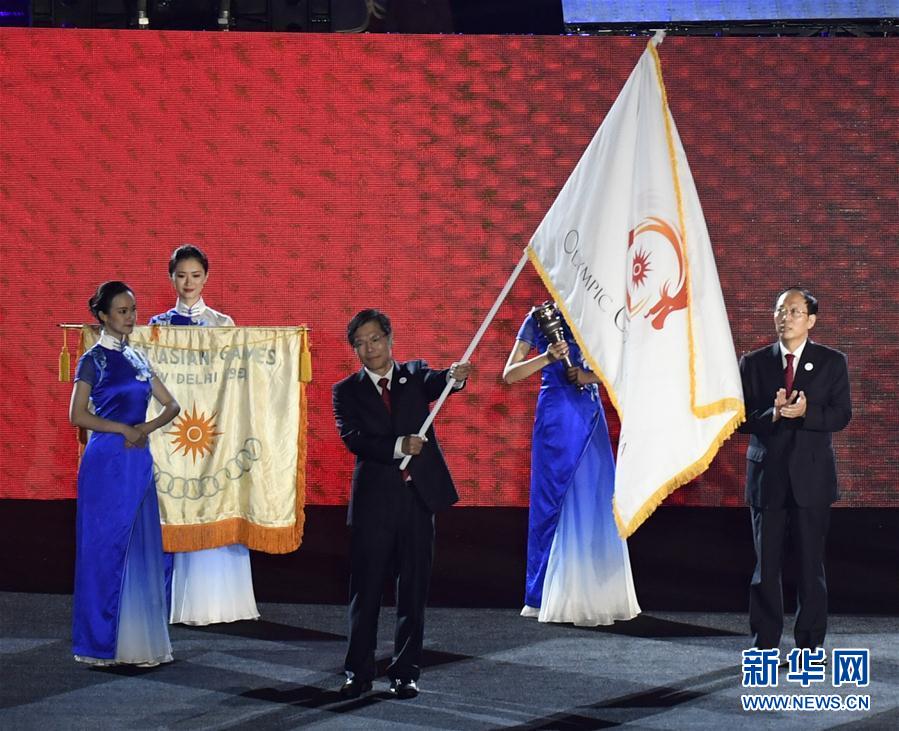 ↑9月2日,第18届亚运会闭幕式在印度尼西亚雅加达举行。 这是闭幕式上的会旗交接仪式。 新华社记者黄宗治摄