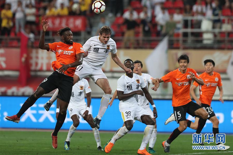 9月2日,贵州恒丰队球员耶拉维奇(左二)在比赛中争顶。 当日,在2018赛季中国足球超级联赛第21轮比赛中,贵州恒丰队主场以1比1战平北京人和队。 新华社记者刘续摄