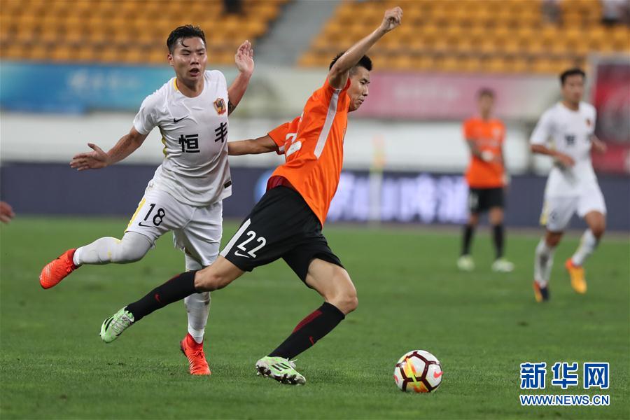 9月2日,北京人和队球员王刚(左二)在比赛中和贵州恒丰队球员闵俊麟(左一)拼抢。 新华社记者刘续摄