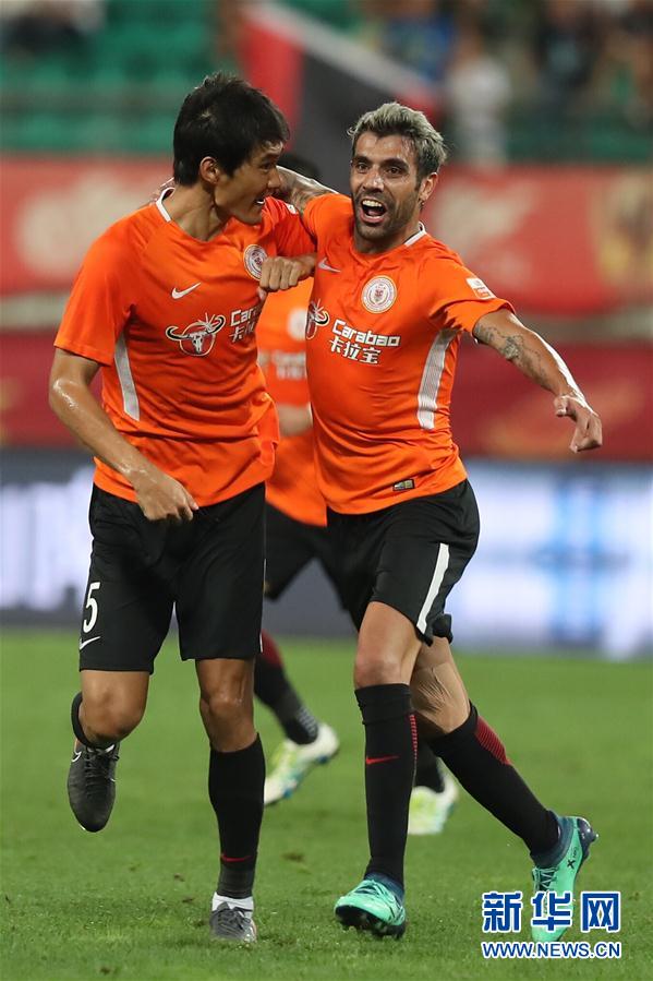 这是9月2日,北京人和队球员奥古斯托(右)在比赛中进球后庆祝。 新华社记者刘续摄