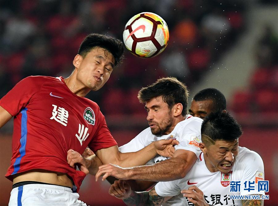 这是9月2日,河南建业队球员陈灏(左)在比赛中争抢头球。 新华社记者李嘉南摄