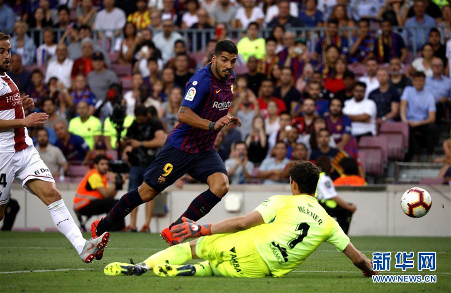 9月2日,巴塞罗那队球员苏亚雷斯(中)在比赛中射门。当日,在2018-2019赛季西班牙足球甲级联赛第三轮比赛中,巴塞罗那队主场以8比2战胜韦斯卡队。新华社发(胡安·戈萨摄)