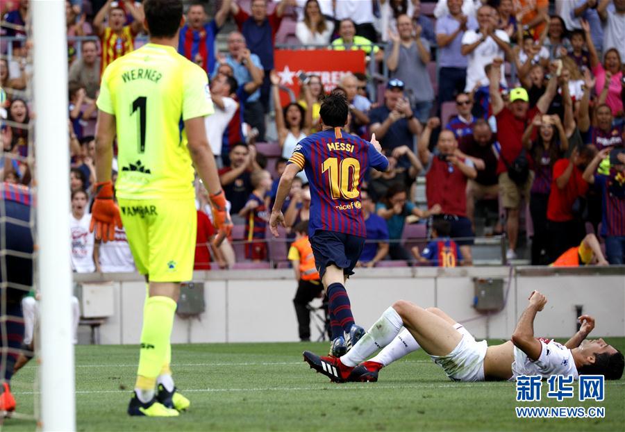 9月2日,巴塞罗那队球员梅西(中)在比赛中庆祝进球。新华社发(胡安·戈萨摄)