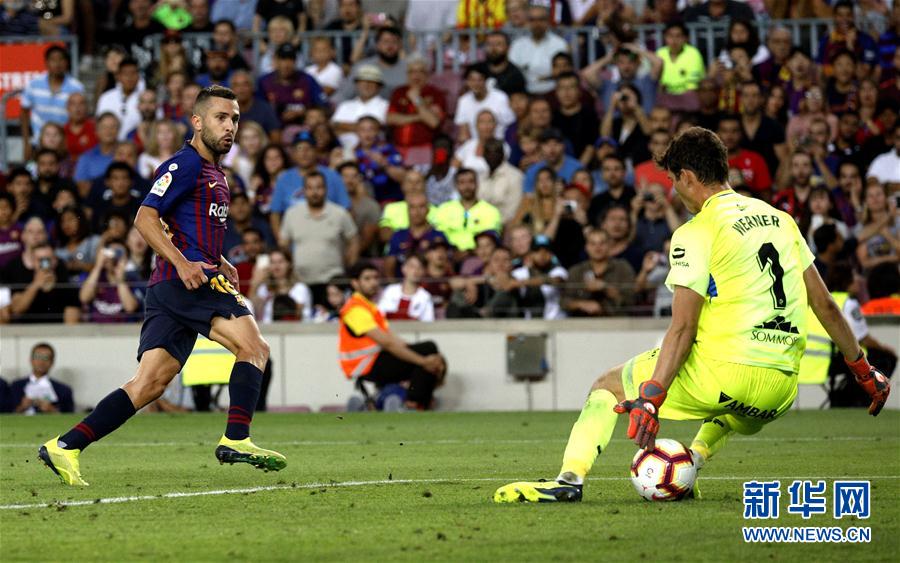 9月2日,巴塞罗那队球员阿尔巴(左)在比赛中射门。新华社发(胡安·戈萨摄)