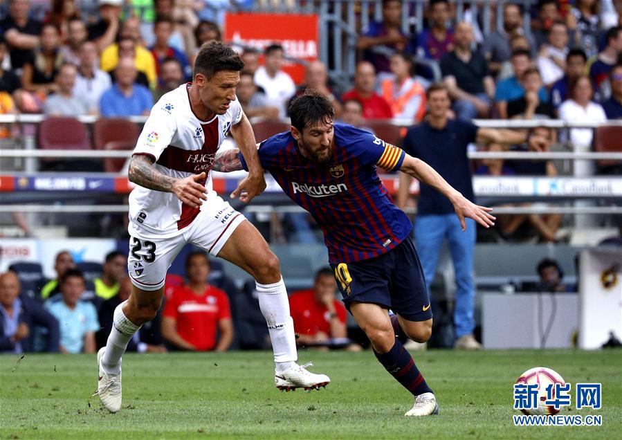 9月2日,巴塞罗那队球员梅西(右)与韦斯卡队球员穆斯托在比赛中拼抢。 新华社发(胡安·戈萨摄)