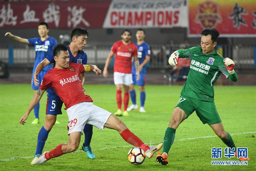 9月2日,广州恒大淘宝队球员郜林(前左)在比赛中射门。 当日,在2018赛季中国足球超级联赛第21轮比赛中,广州恒大淘宝队主场以2比1战胜上海绿地申花队。 新华社记者邓华摄