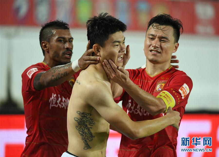 9月2日,广州恒大淘宝队球员杨立瑜(中)进球后同队友庆祝。 新华社记者邓华摄