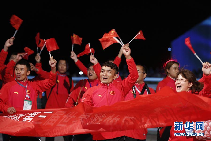 9月2日,中国代表队在开幕式上入场。当日,第三届世界游牧民族运动会在吉尔吉斯斯坦伊塞克湖州小城乔尔蓬阿塔开幕。来自80个国家和地区的2000多名运动员将参加37个项目的角逐。中国代表队此次派出39人参赛。 新华社发(罗曼摄)