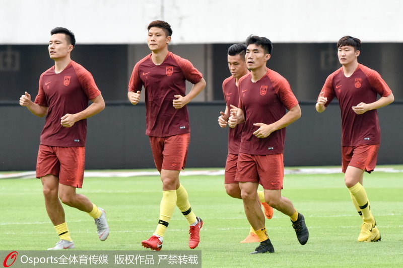 国足队员慢跑训练