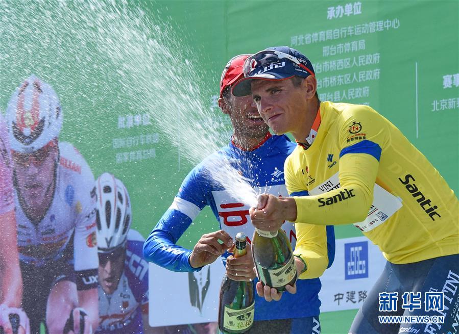 9月4日,保有黄色领骑衫的意大利日波-维尼凡蒂尼洲际职业队的达米亚诺(右一)在领奖台上庆祝。 新华社记者杨世尧摄