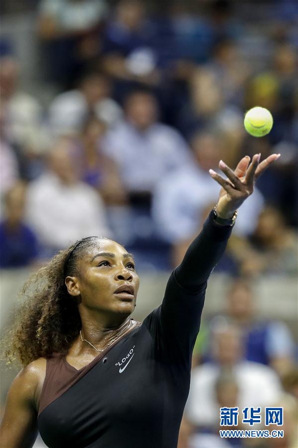 9月4日,塞雷纳·威廉姆斯在比赛中发球。 当日,在2018美国网球公开赛女单四分之一比赛中,美国选手塞雷纳·威廉姆斯以2比0战胜捷克选手普利斯科娃,晋级四强。 新华社记者李木子摄