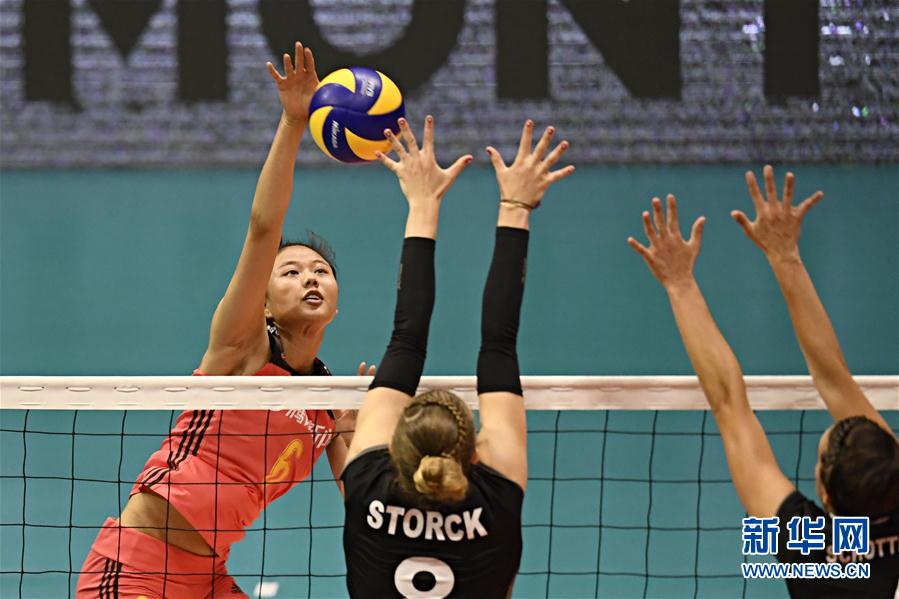 9月4日,中国队球员龚翔宇(左一)在比赛中扣球。 当日,在瑞士蒙特勒举行的2018年瑞士女排精英赛揭幕战中,中国队以3比0战胜东道主瑞士队。 新华社发(阿兰·格罗克洛德摄)