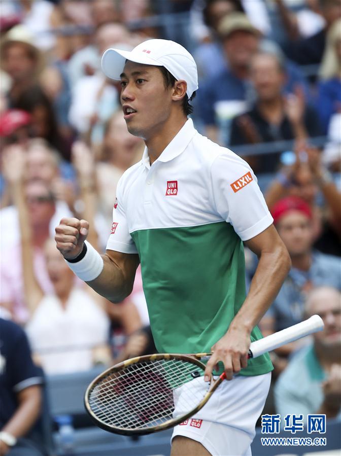 9月5日,锦织圭在比赛中庆祝得分。 新华社记者王迎摄