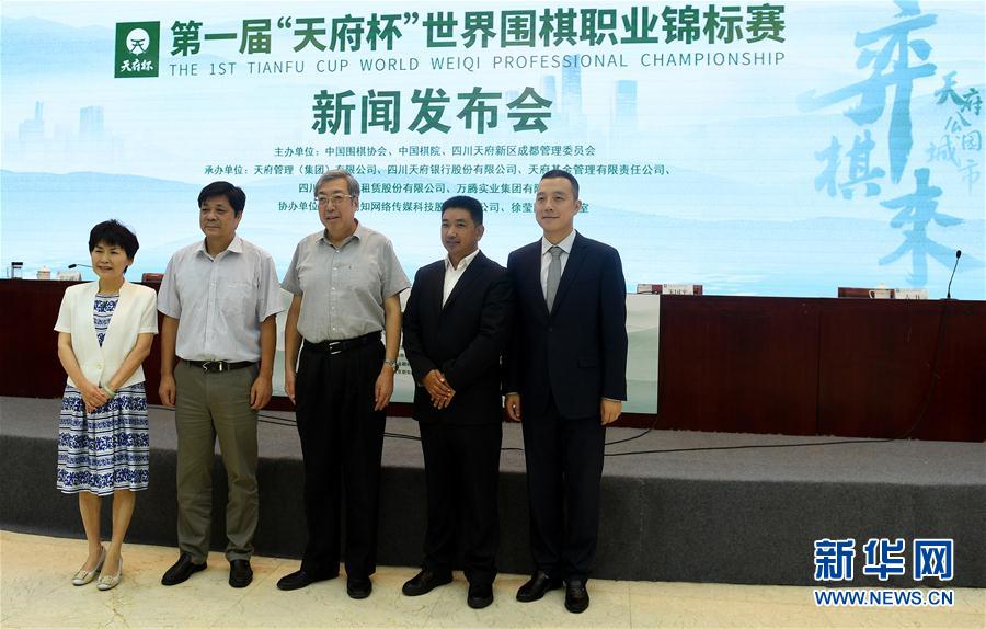 ↑9月6日,中国围棋队领队华学明(左一)、国家体育总局棋牌运动管理中心主任朱国平(左二)、中国围棋协会主席林建超(中)和中国围棋选手古力(右一)等在新闻发布会后合影。 新华社记者贾宇辰摄