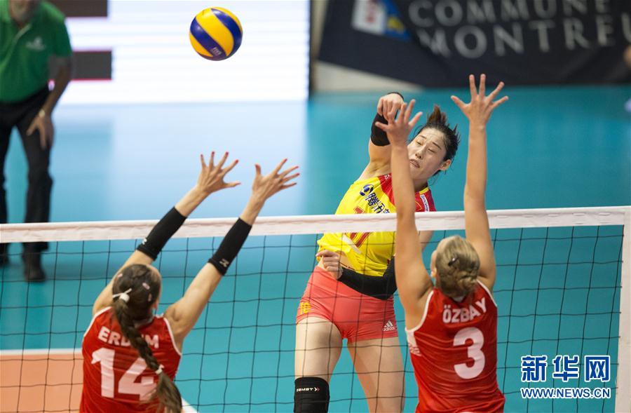 9月6日,中国队球员刘晓彤(中)在比赛中扣球。 新华社记者徐金泉摄