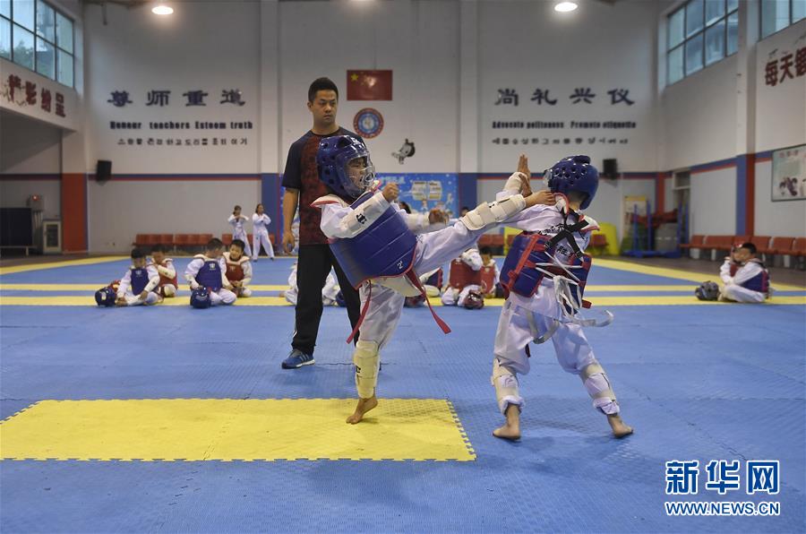 9月5日,成都市盐道街小学得胜分校四年级六班的两名学生在进行跆拳道实战对抗。 在教育部规定的“中小学生每天锻炼一小时”的基础上,成都市锦江区于2016年9月在20所义务段公办学校试行“每天一节体育课”。将原来每天由非体育老师组织的“锻炼一小时”优化为专业体育课,加大投入,增配专业体育老师,每所学校可以根据各自的特色来设置不同的课程。 新华社记者刘坤摄