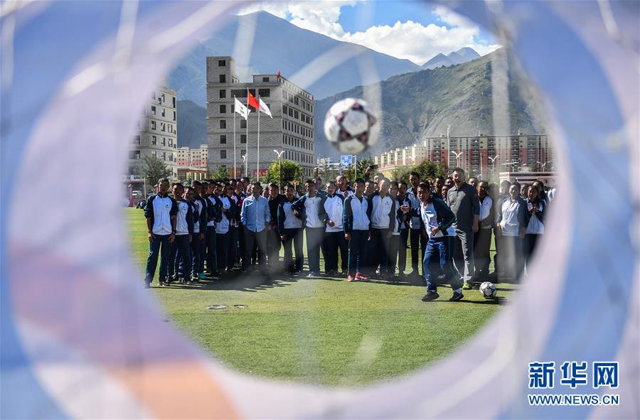↑9月7日,足球运动员刘超、周宁和孩子们一起进行穿越五环的足球游戏。 当日,由中国奥委会市场开发部联合西藏自治区体育局共同主办的“奥运健儿公益服务大行动”在西藏拉萨北京实验中学举办。奥运健儿通过体操、奥运讲堂、足球射门等形式,让孩子们对奥林匹克运动有了直观了解。 新华社记者晋美多吉摄