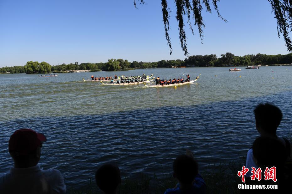 9月8日,2018年圆明园龙舟文化交流活动暨首届“圆明园”杯龙舟竞演在北京圆明园福海举行。据悉,竞演执行国际龙舟联合会规则,进行12人标准龙舟混合组200米直道竞演,共有圆明园龙舟队、北京大学龙舟队、国际友人龙舟队等11支队伍参加。图为岸边游客驻足观看龙舟竞演。 中新社记者 崔楠 摄
