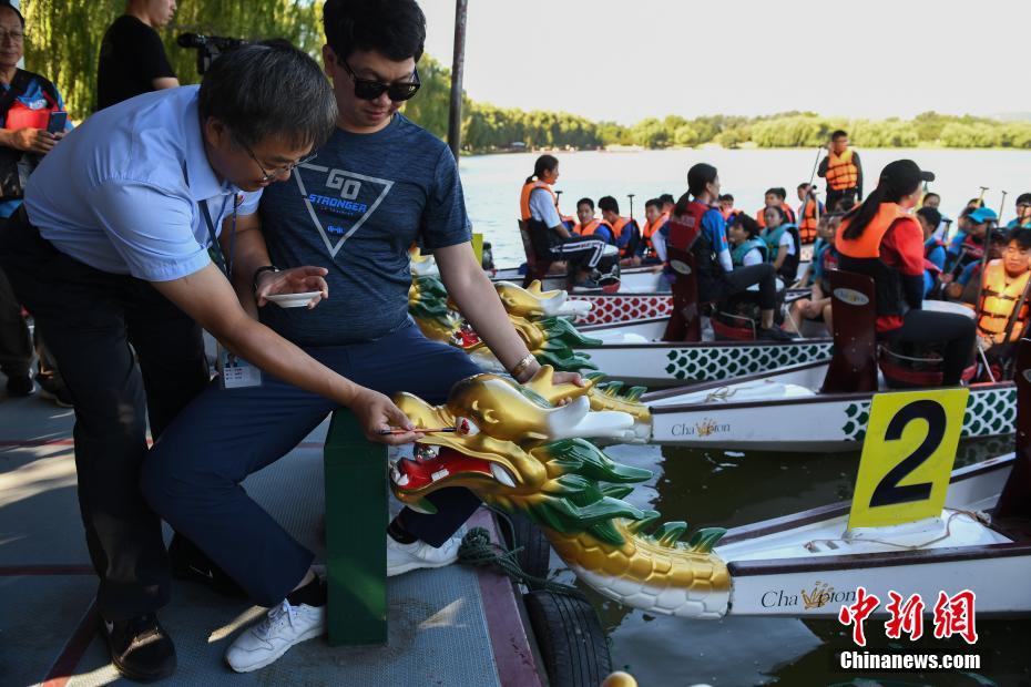 圆明园管理处副主任李向阳为竞演龙舟点睛。 中新社记者 崔楠 摄