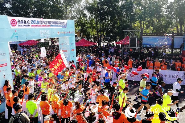 上午8时55分,“镜马”在镜泊湖北门广场鸣枪开赛。随着发令枪响起,近万人的庞大队伍开始起跑,既有冲锋在前的国内外专业选手,又有不甘落后的马拉松爱好者。这群来自五湖四海的跑友相聚在一条独具特色的万年以前火山喷发形成的熔岩台地上,用奔跑的方式领略牡丹江这座城市的魅力和镜泊湖特有风光。