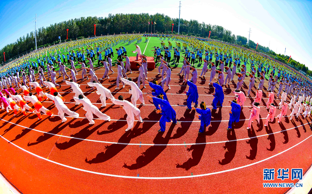 在亳州中药科技学校的操场上,健身爱好者练习五禽戏。