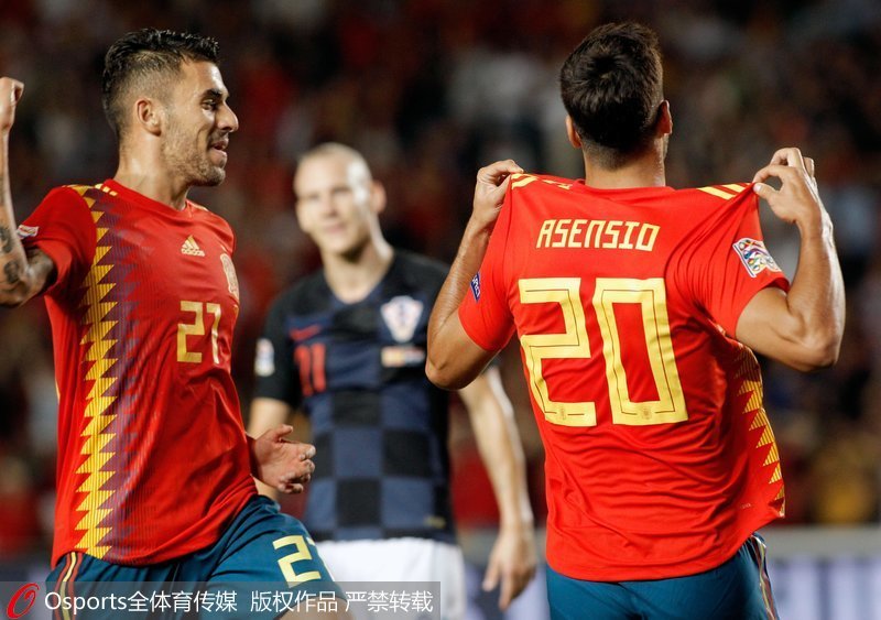 人民网北京9月12日电 北京时间今天凌晨2:45,欧洲国家联赛继续进行,西班牙坐镇主场迎战克罗地亚。本场比赛阿森西奥表现抢眼,上演助攻帽子戏法的他进球后又造卡里尼奇自摆乌龙,萨乌尔、罗德里戈、拉莫斯和伊斯科进球。最终,西班牙6-0大胜克罗地亚,取得两连胜,克罗地亚队则遭到队史最大比分失利。