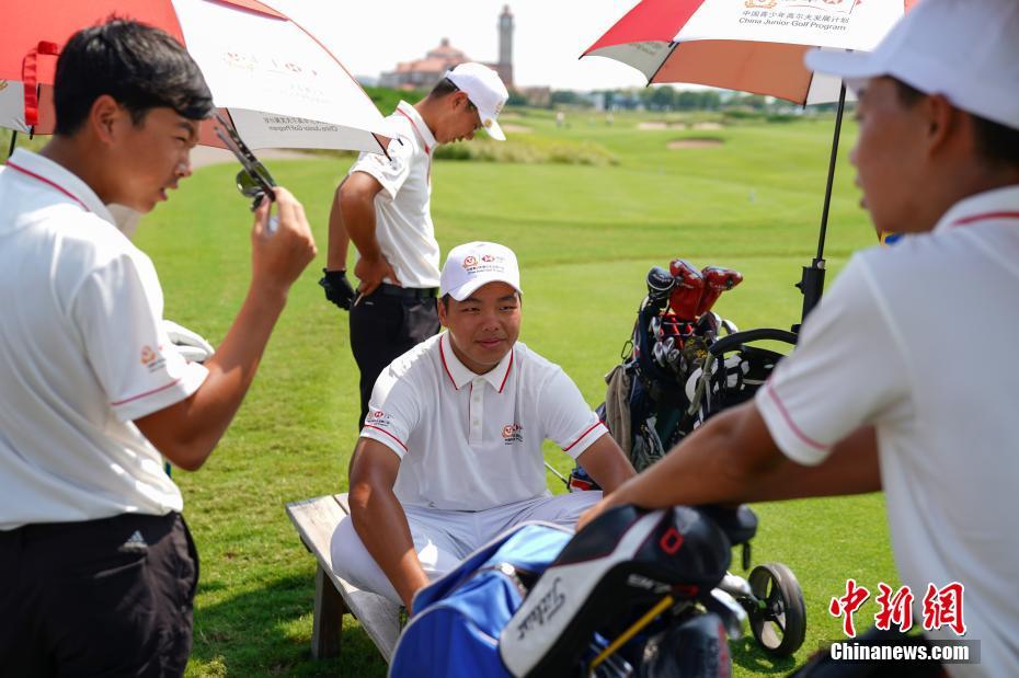9月15日,2018汇丰中国青少年高尔夫冠军赛总决赛在上海林克司乡村俱乐部落幕。选手陈顾新以213杆,低于标准杆3杆的成绩夺得总决赛男子U18组冠军。选手方歆媛则以216杆,平标准杆的成绩夺总决赛女子U18组冠军。图为男子U18组选手们在等待开球时交谈放松。中新社记者 崔楠 摄
