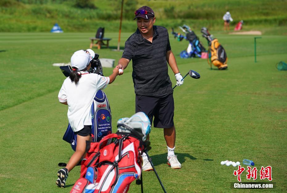 9月15日,2018汇丰中国青少年高尔夫冠军赛总决赛在上海林克司乡村俱乐部落幕,刘国梁携女儿刘宇婕现身赛场。刘宇婕在此次比赛中以总杆数117杆夺得女子U9组冠军。图为赛后刘国梁父女在训练场练习。中新社记者 崔楠 摄