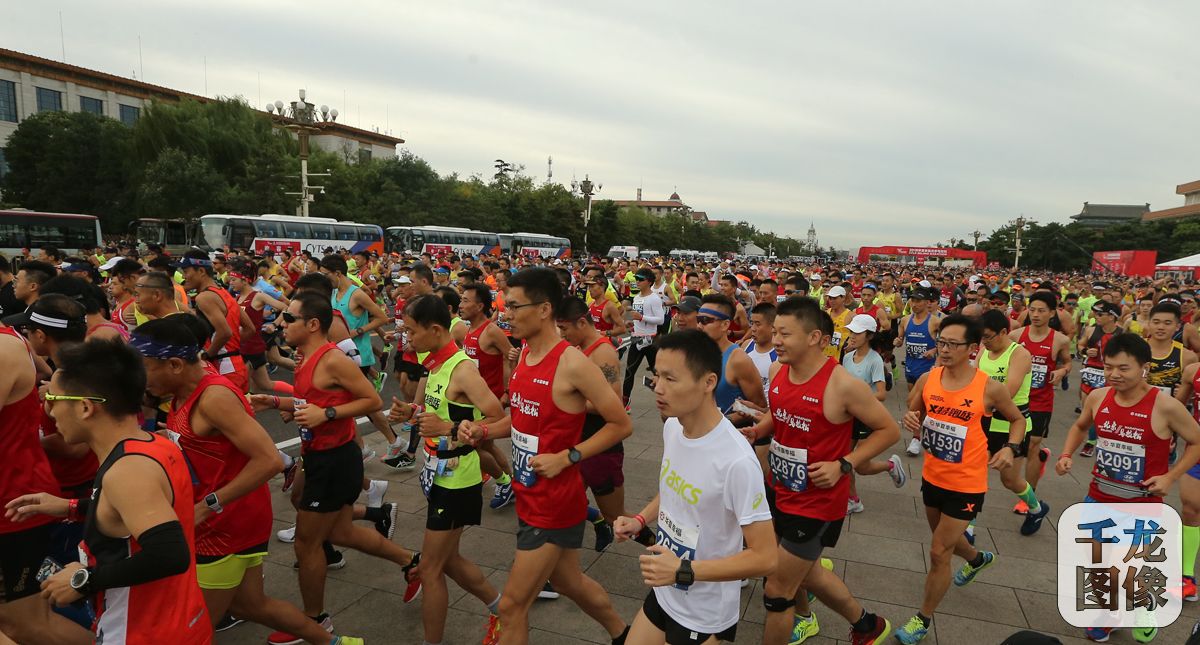 9月16日,2018华夏幸福北京马拉松(以下简称“北马”)在天安门广场顺利起跑,来自40多个国家和地区的约3万名长跑爱好者纷纷迈开脚步,场面蔚为壮观。图为天安门广场起跑精彩瞬间。千龙网记者 戚连民摄