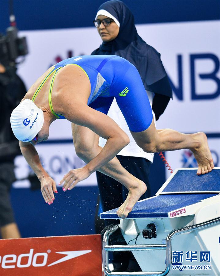 9月14日,舍斯特伦在比赛中入水。 当日,在卡塔尔首都多哈举行的国际泳联游泳世界杯卡塔尔站女子200米自由泳决赛中,瑞典选手舍斯特伦以1分56秒32的成绩夺得冠军。 新华社发(尼库摄)