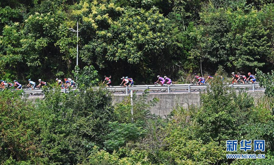 9月15日,选手们在比赛中骑行。 当日,2018第九届环鄱阳湖国际自行车大赛宜春靖安站比赛在江西省宜春市靖安县举行。 新华社记者万象摄