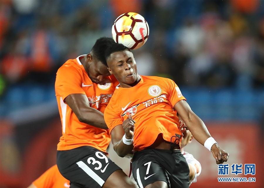 9月16日,北京人和队球员马西卡(右)、迪奥普在比赛中争顶。 当日,在2018中超联赛第22轮比赛中,北京人和队主场迎战河北华夏幸福队。 新华社记者曹灿摄