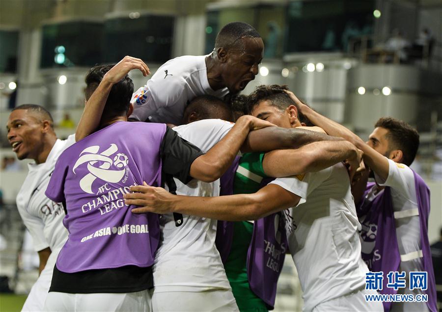 9月17日,阿尔萨德队球员邦尼德加(右二)与队友在比赛中庆祝进球。 当日,在卡塔尔首都多哈进行的2018年亚冠联赛四分之一淘汰赛第二回合比赛中,卡塔尔阿尔萨德队主场以2比2战平伊朗德黑兰独立队,从而以两回合总比分5比3晋级半决赛。 新华社发(尼库摄)
