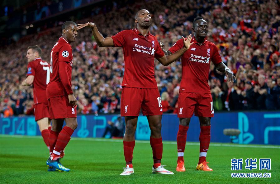 9月18日,利物浦队球员斯图里奇(右二)在比赛中庆祝进球。 当日,在2018-2019赛季欧洲足球冠军联赛C组首轮比赛中,英超利物浦队主场以3比2战胜法甲巴黎圣日耳曼队。 新华社发