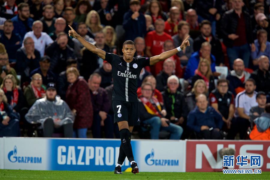 9月18日,巴黎圣日耳曼队球员姆巴佩庆祝进球。 当日,在2018-2019赛季欧洲足球冠军联赛C组首轮比赛中,英超利物浦队主场以3比2战胜法甲巴黎圣日耳曼队。 新华社发