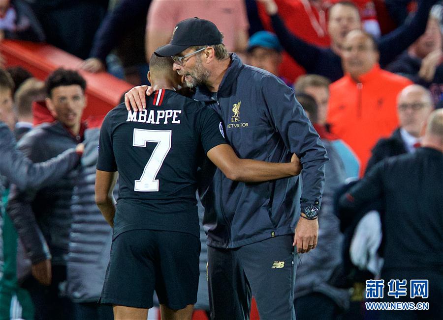 9月18日,利物浦队主帅克洛普(右)赛后与巴黎圣日耳曼队球员姆巴佩拥抱致意。 当日,在2018-2019赛季欧洲足球冠军联赛C组首轮比赛中,英超利物浦队主场以3比2战胜法甲巴黎圣日耳曼队。 新华社发