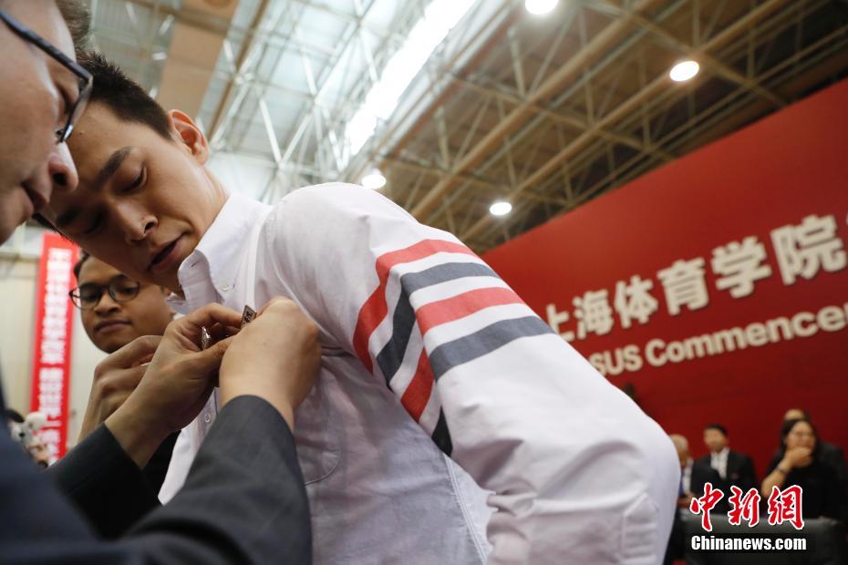 孙杨在开学典礼上佩戴校徽。殷立勤 摄