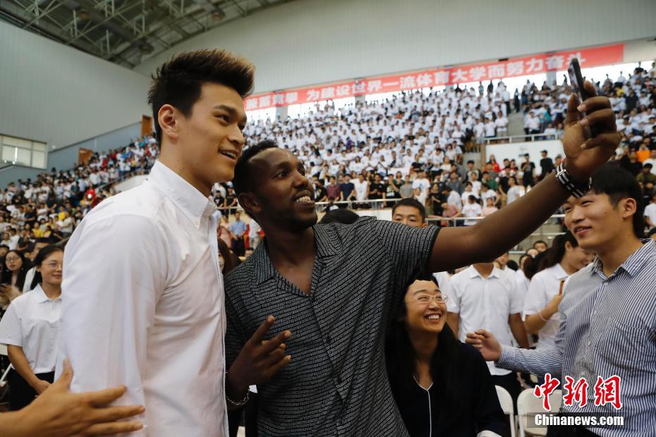 孙杨在开学典礼上与外籍留学生合影。殷立勤 摄