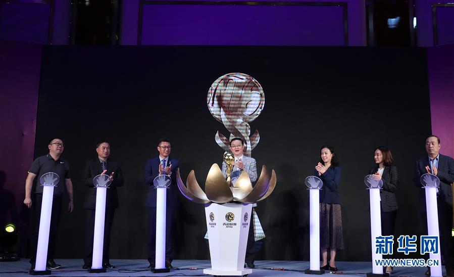 ↑9月19日,嘉宾在发布会上共同揭晓总冠军奖杯。当日,全国青少年足球超级联赛(青超联赛)“不藏锋芒”发布会在北京举行,年度总冠军奖杯与赛事官方logo正式亮相。 新华社记者曹灿摄
