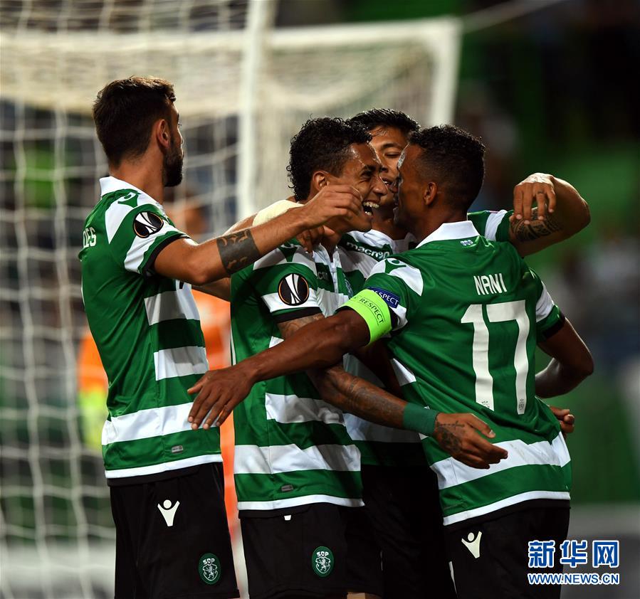 9月20日,葡萄牙体育队球员拉菲尼亚(左二)打入球队首球后与队友庆祝。 当日,在葡萄牙首都里斯本举行的2018-2019赛季欧罗巴联赛E组首轮比赛中,葡萄牙体育队主场以2比0战胜阿塞拜疆卡拉巴赫队。 新华社记者张立云摄